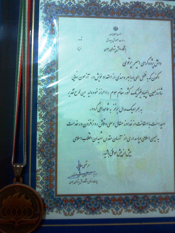 - مدال برنز المپیاد فیزیک ایران - باشگاه دانش پژوهان جوان - تابستان 1382
