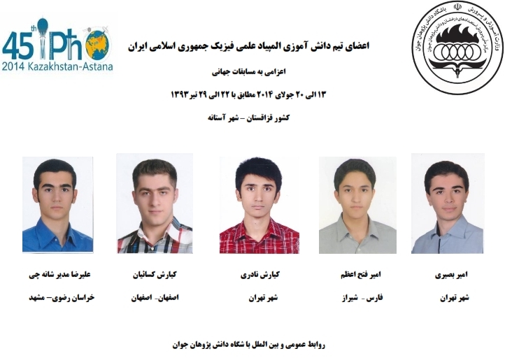 بعد از گذشت بیش از یک سال رقابت و تلاش مستمر، قافله بیست و ششمین المپیاد فیزیک ایران به مقصد رسید و اعضای تیم ملی المپیاد فیزیک ایران برای اعزام به چهل و پنجمین دوره المپیاد جهانی فیزیک که از 22 تا 30 تیر 1393 (13 تا 21 جولای 2014) در شهر آستانه قزاقستان برگزار خواهد شد، از سوی باشگاه دانش پژوهان جوان معرفی شدند :